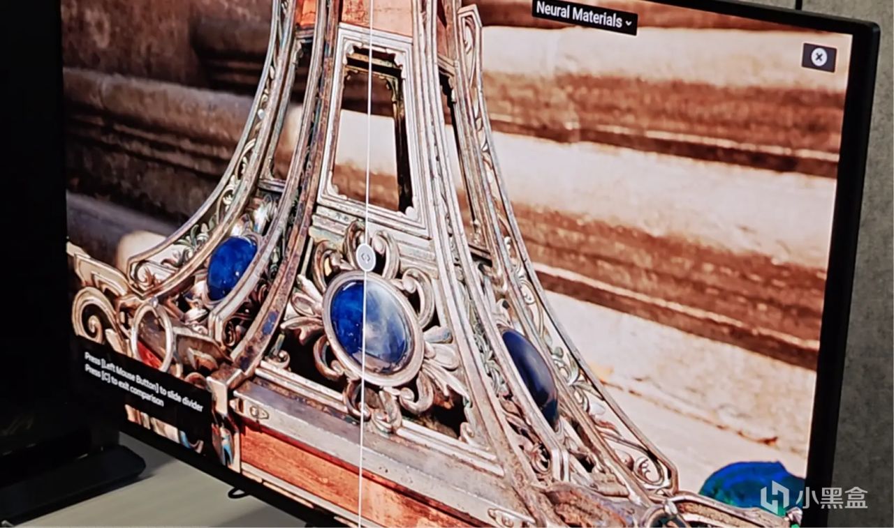 这两台显示器的画面几乎一模一样,不过两块屏幕显示的并不是同一台电脑的镜像画面,而是为了大家更直观的感受DLSS 4技术对游戏帧率的提升所采取的控制变量法——两台配置完全一样的高端电脑(AMD Ryzen 9-9800X3D CPU搭配RTX 5080显卡),在同画面配置(4K分辨率,影视级画质,超高光线追踪)下,开启DLSS 4与关闭DLSS 4时的画面,可以看到,在这个距离时,DLSS 4所渲染的画面与选胜画面几乎无差异,完全不用担心超分辨率技术对游戏画面的影响。