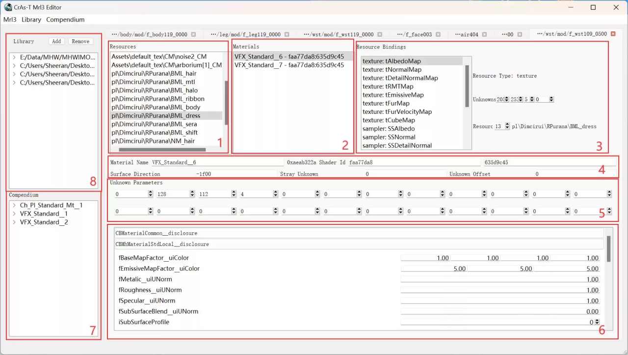 1-資源區;2-材質區;3-資源指引/綁定區;4&5-材質數據頭;6-參數序列;7&8-材質概要區與材質庫