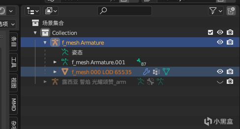 如果你發現你的模型也有高光這樣的透明材質,說明要多一步,物體模式選中模型,找到高光的遮罩網格,整個刪掉,不然進遊戲會顯示報錯