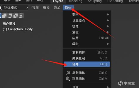 接着我們先選中我們的模型,再選中世界模型,按下Ctrl+J就可以把他們融合了,如果不行可以按左上角的物體-合併