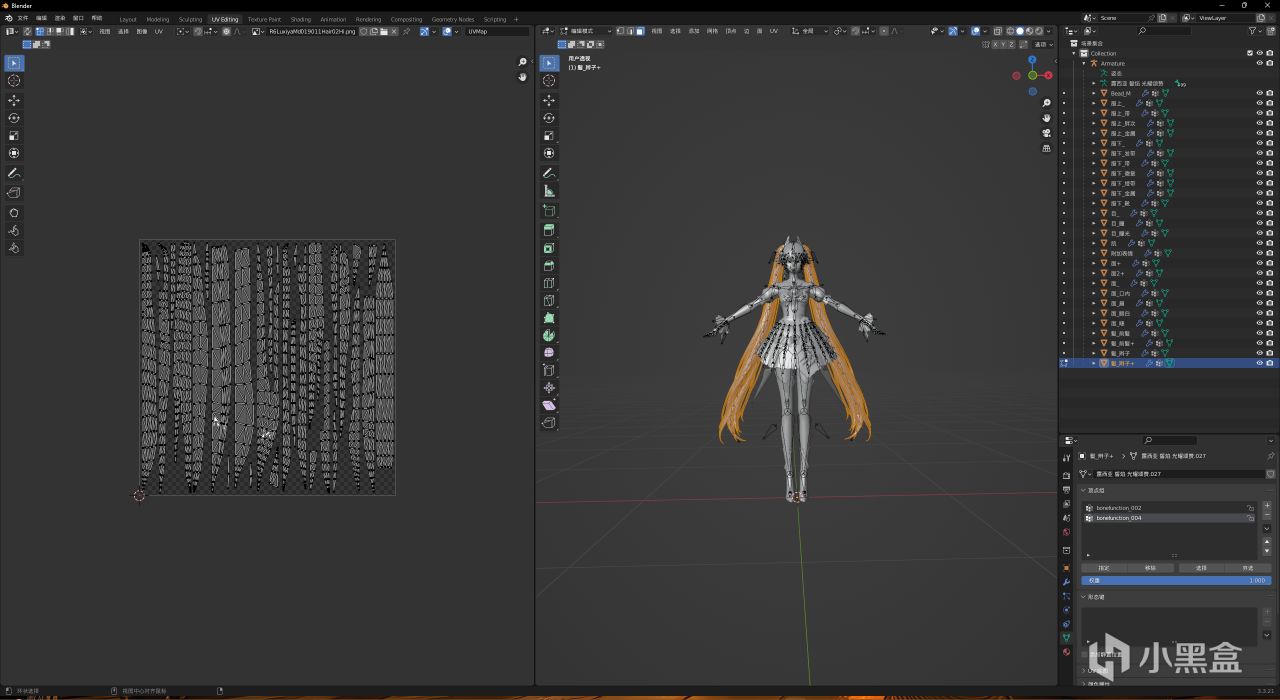 這一期我們講一講後續貼圖的導出和遊戲內替換,上一期我們是把遊戲骨骼吸附到了我們的模型上,還把權重全部重新處理了,如下;