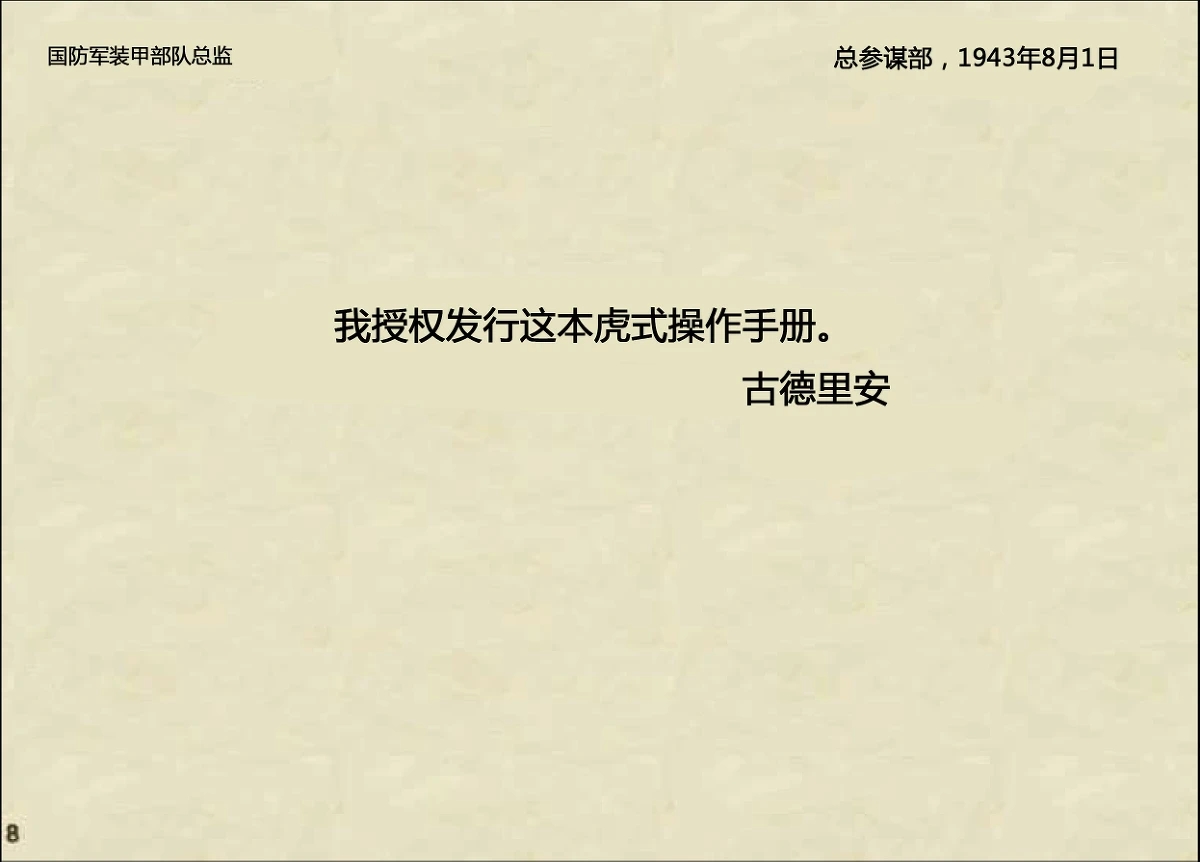 該手冊由國防軍裝甲部隊總監於1943年8月1日出版,由約瑟夫·馮蓋爾特茨少尉編寫,古德里安作爲裝甲兵總監簽字授權發行