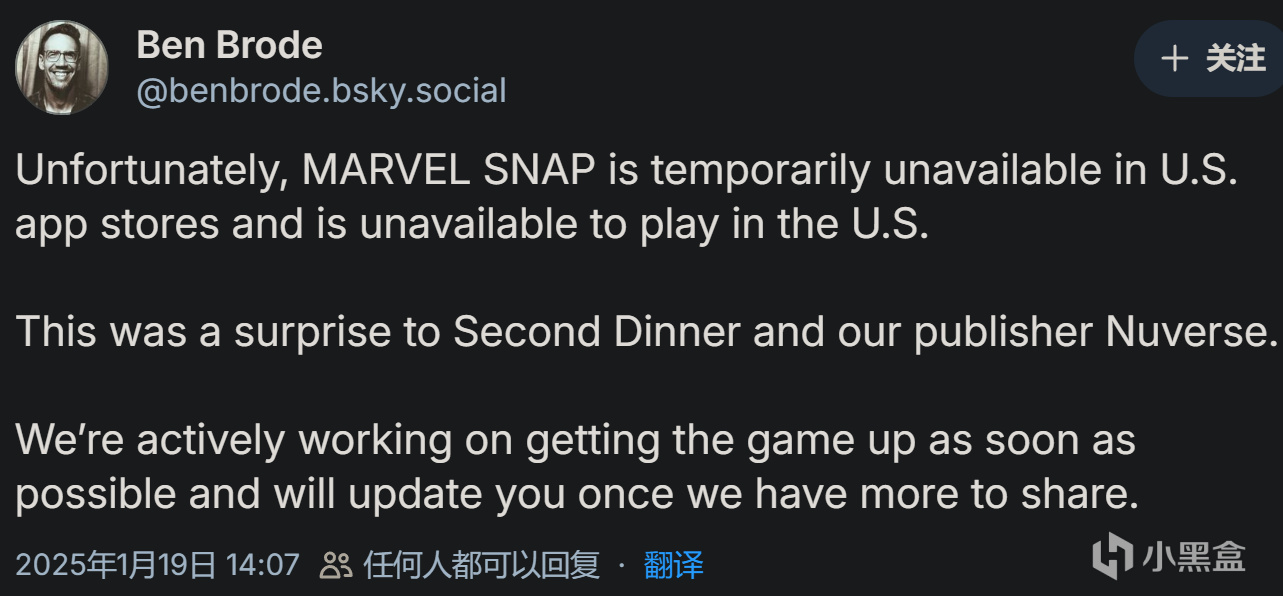 原因也很简单,《Marvel Snap》的发行商是朝夕光年(NUVERSE),2022年,Second Dinner将《Marvel Snap》的全球发行权交给了字节旗下的是朝夕光年,2023年的时候字节对游戏部门进行组织架构调整,不过并没有影响《Marvel Snap》的正常运营。但让人颇感意外的是这次Tiktok被关闭,也直接导致字节海外发行的游戏也受到波及。
