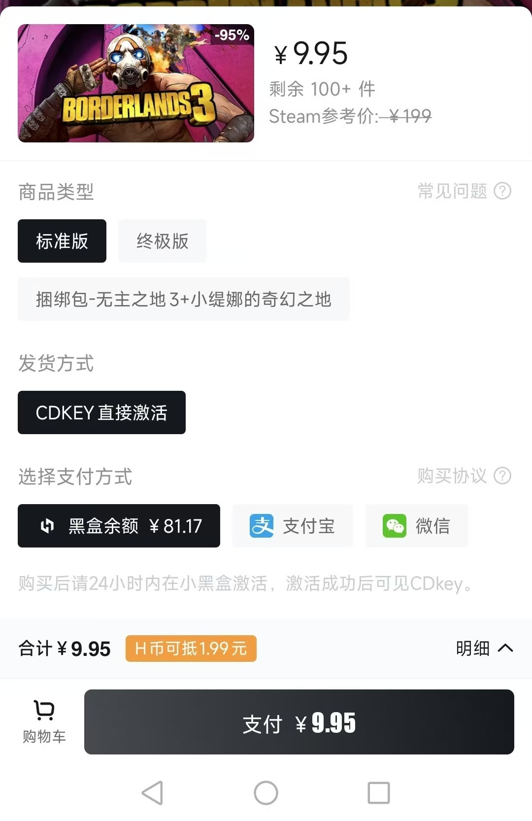 《无主之地3》标准版,原价199元,小黑盒现只需9.95元,折扣为-95%OFF