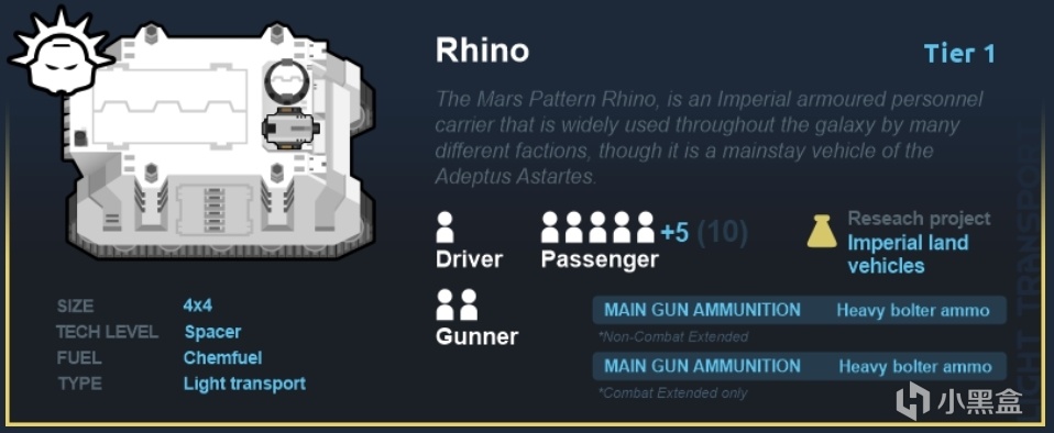 犀牛是帝國的裝甲運兵車,廣泛應用於銀河系的許多派系,儘管它是星際戰士的主力戰載,卻也被其他派系廣泛採用。