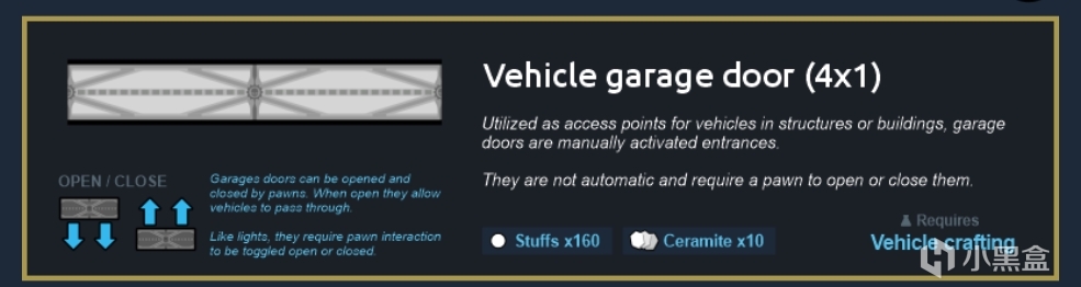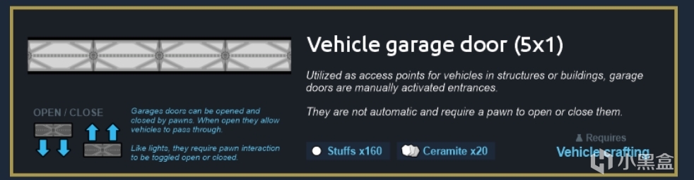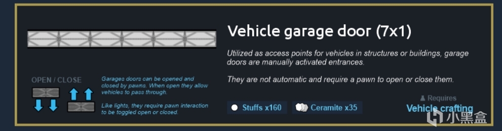 用作建築或設施中戰載的出入口,車庫門需由角色手動開閉,不具備自動化功能。