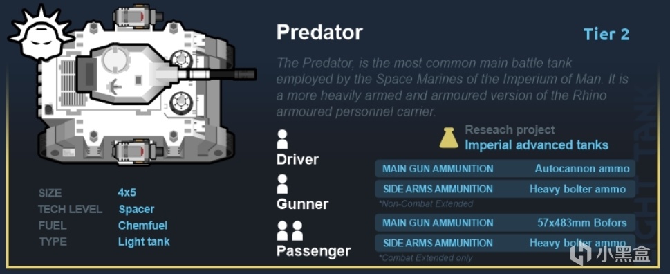 獵食者是帝國星際戰士使用的最常見主戰坦克。它是犀牛裝甲運兵車的強化版本,具備更強的武裝與防護能力。