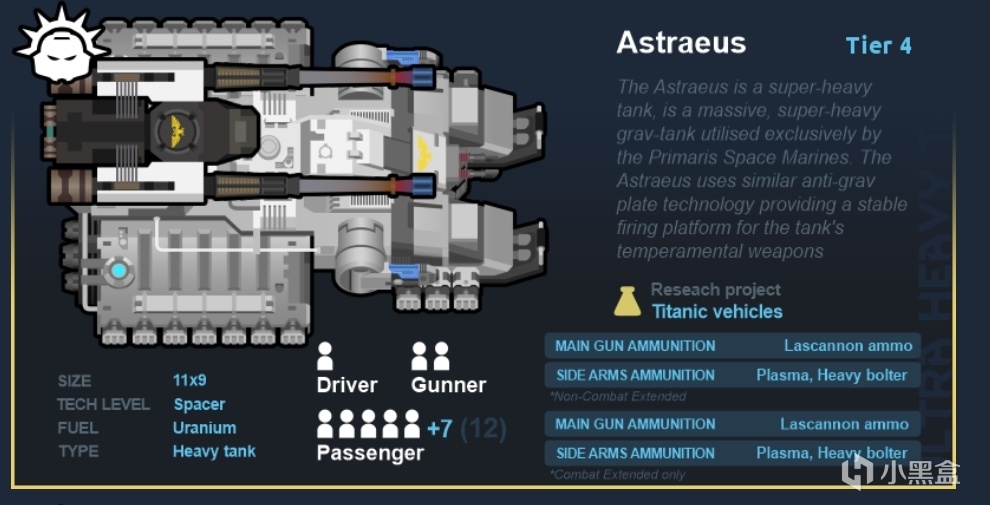 阿斯特賴俄斯超重型坦克是一種巨型超重型反重力坦克,僅供首生星一種巨型超重型反重力坦克,僅供原鑄星際戰士使用。其採用了類似的反重力板技術,爲其多變的武器提供了穩定的射擊平臺。