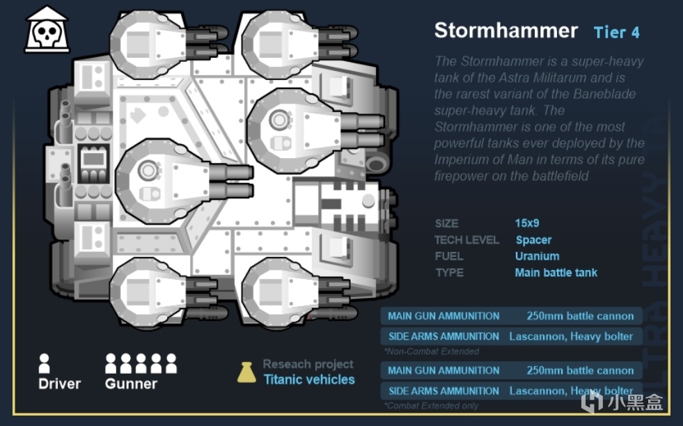 風暴之錘是星界軍的超重型坦克,也是破壞之刃系列中最爲罕見的變體之一。就純粹的戰場火力而言,風暴之錘是人類帝國中最強大的坦克之一。