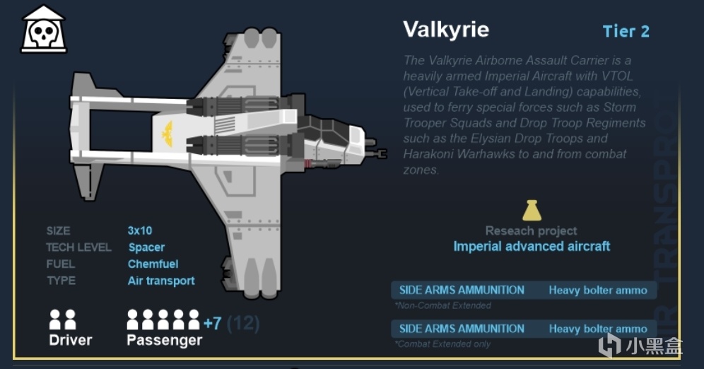 女武神空降突擊運輸機是一種重武裝的帝國飛行器,具備垂直起降能力(VTOL)。它常被用來運送特種部隊,如風暴忠嗣兵(Storm Trooper)或空降團(如艾麗西亞空降團與哈拉科尼戰鷹)進出戰區。