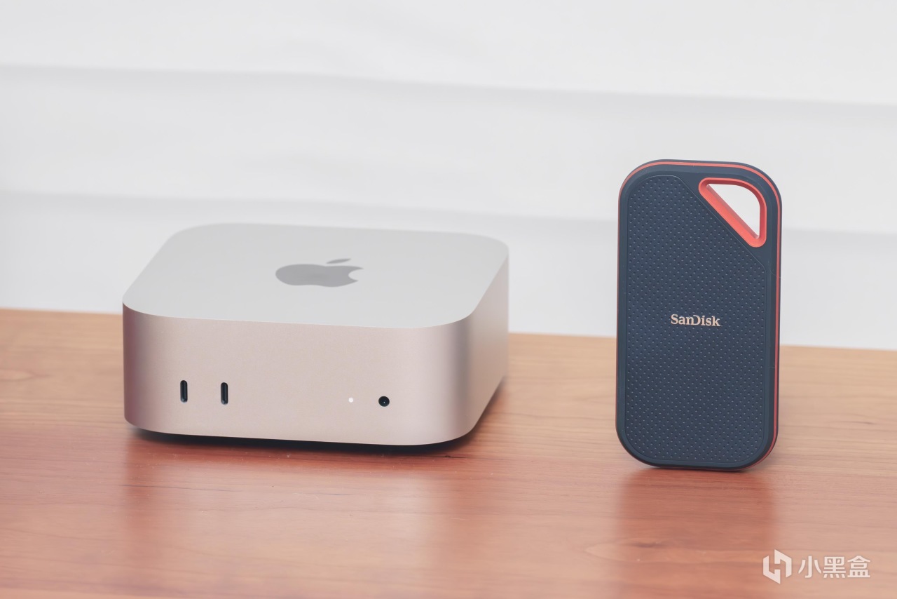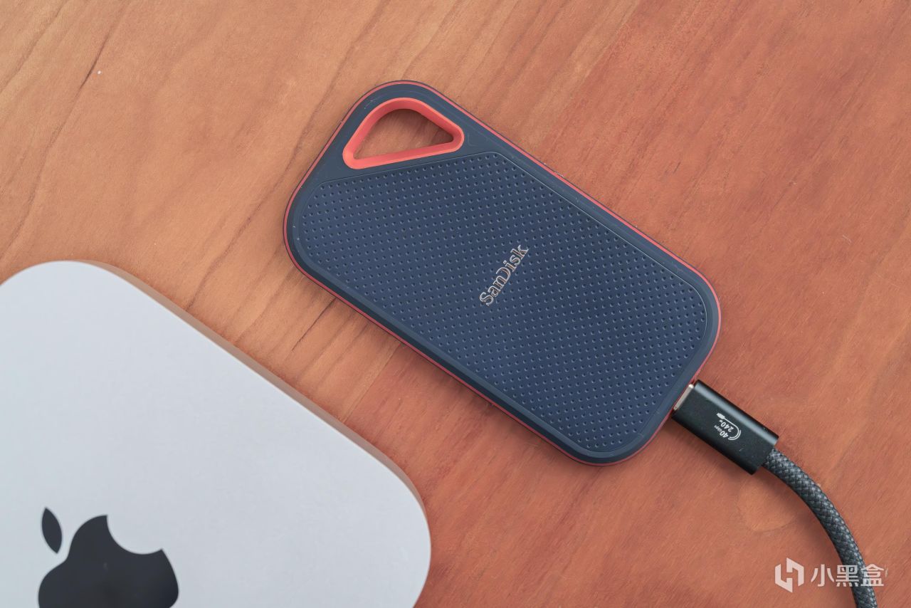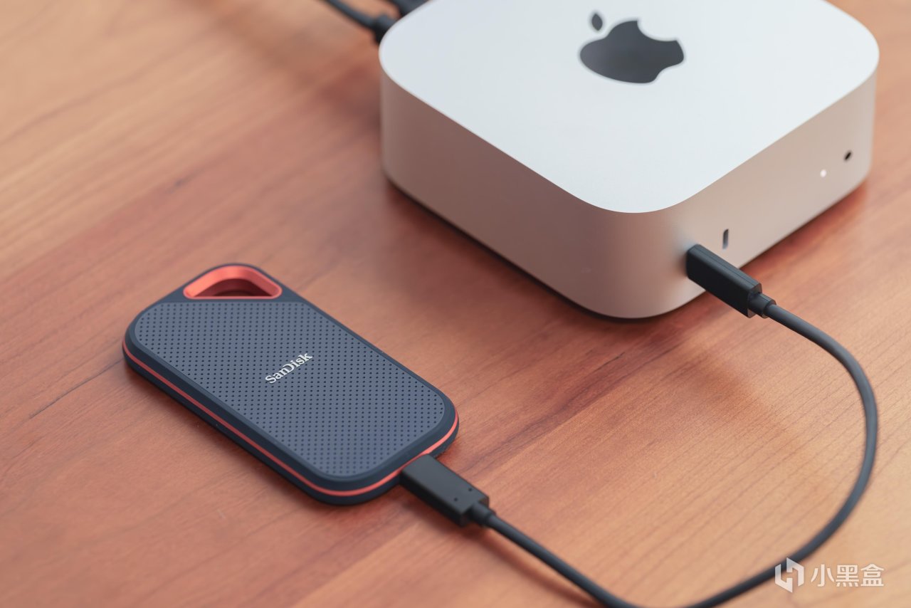 在使用硬盤連接電腦時,Macmini 擁有兩個前置 USB-C(10Gbps)和三個後置 USB-C(40Gbps)。因爲閃迪 E81 至尊超極速 Pro 移動固態硬盤是 USB 3.2 Gen 2×2,帶寬速率達到了 20Gbps,僅次於 USB 4 和雷電端口,基於向下兼容原則,理論上雷靂 4 端口才能發揮這塊移動固態硬盤的最大實力。