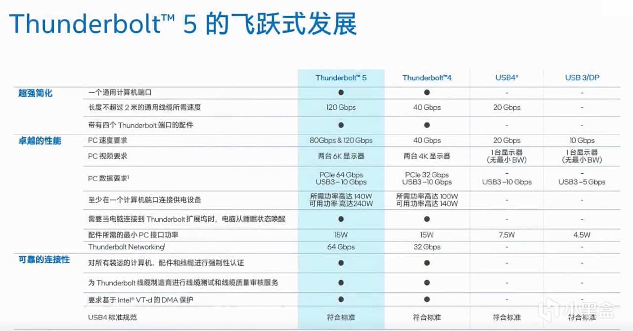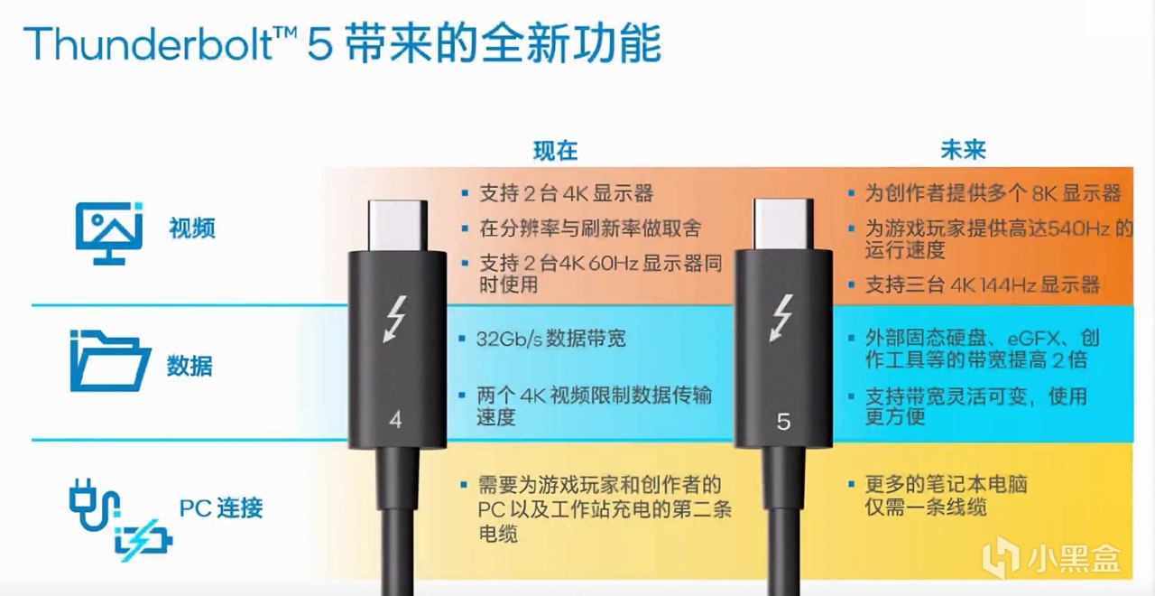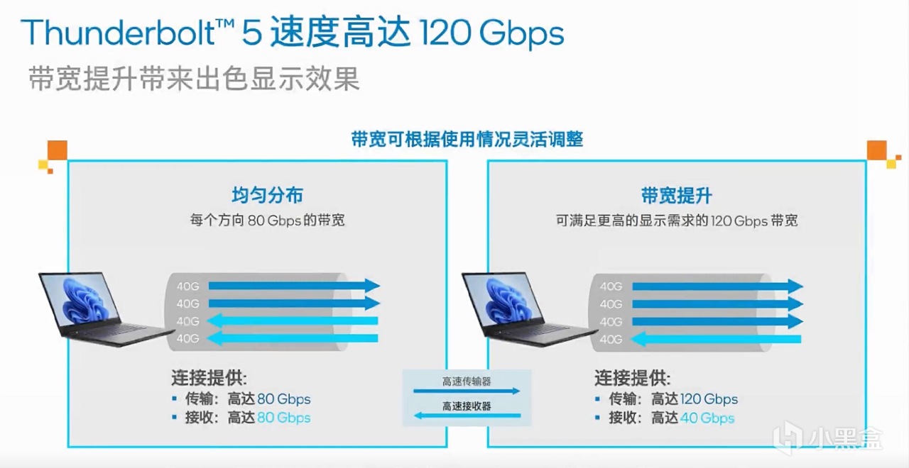 作爲雷電 5 數據線,它的單向總帶寬達到了 80Gbps,如果是雙向的非對稱帶寬模式,其總帶寬可以達到 120Gbps。這其中包括一個方向 80Gbps,另一個方向 40Gbps。