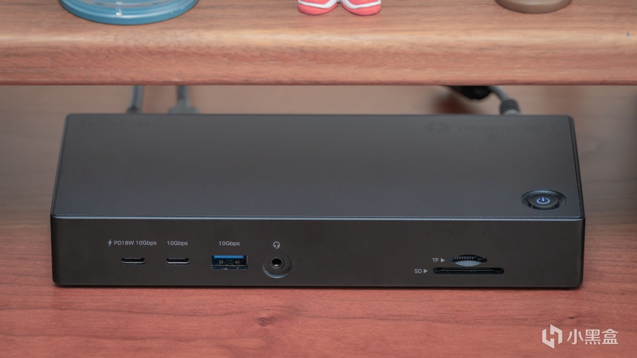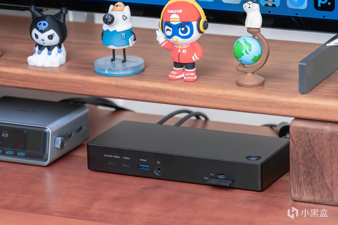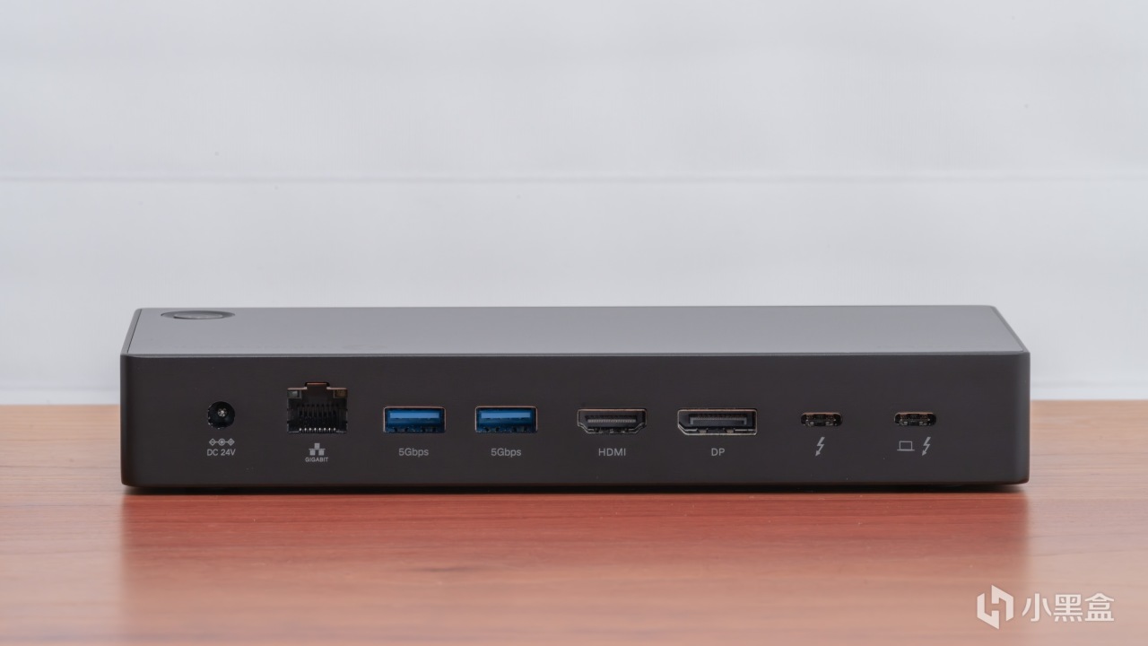 在拓展塢的背面,I/O 端口更加豐富了,數據端口是 2 個雷電 4(40Gbps)和 2 個 USB-A(5Gbps),視頻端口是 DP 1.4 + HDMI 2.0 的組合,另外還有一個 1000Mbps 有線網口 + DC 供電口。