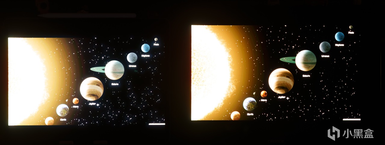 對比頂級 MiniLED 方案的 iPad Pro 12.9 吋 2020 款,OLED 屏幕在顯示星空一類的場景時,沒有任何的光暈,沉浸感更好。