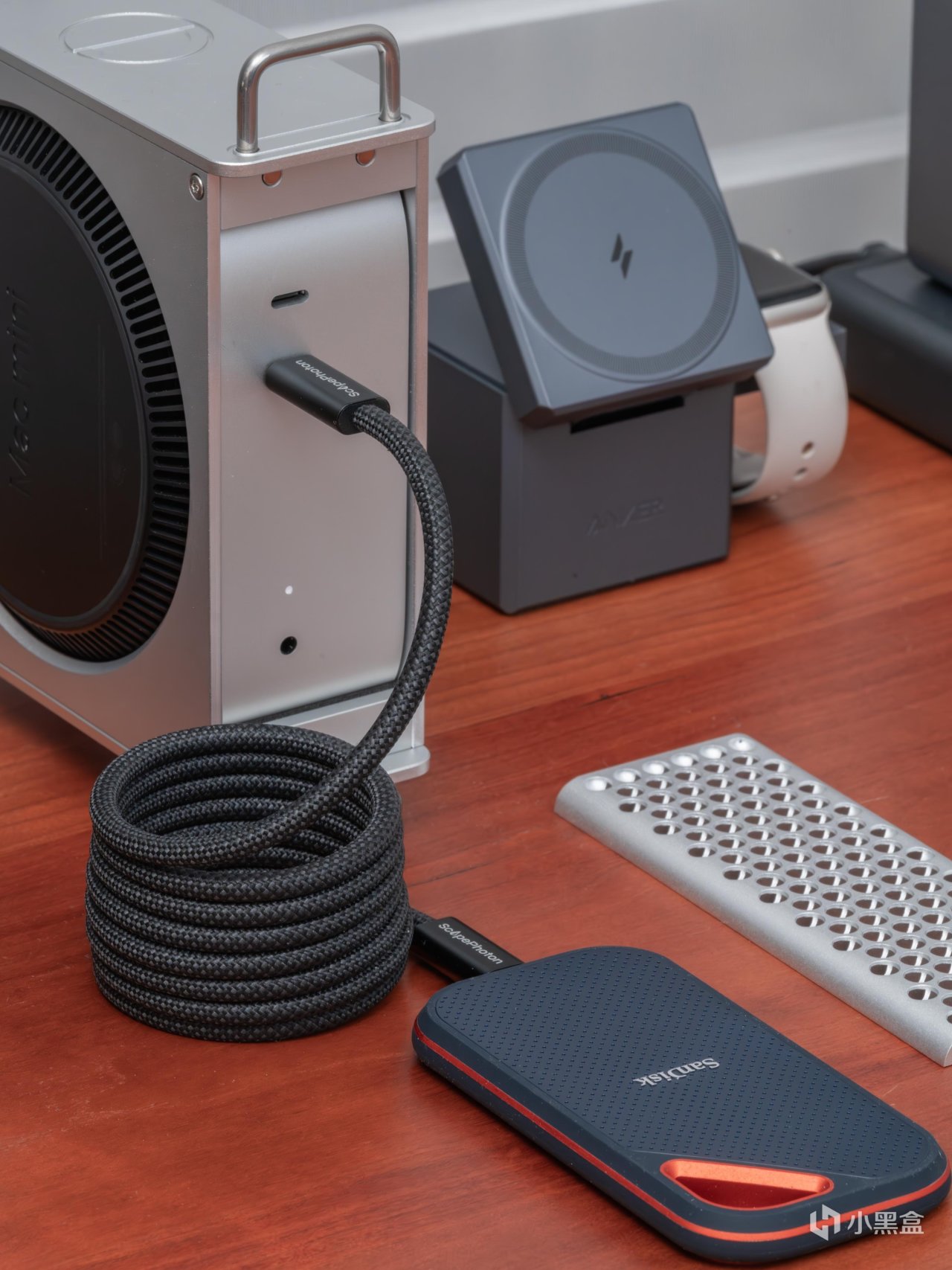 因爲它內置了 USB-IF 認證 E-marker 智能芯片,所以全接口兼容,所以可以向下適配 USB-C 3.2 Gen1(5Gbps)、3.2 Gen2(10Gbps)、3.2 Gen2×2(20Gbps)、雷電 4/ USB 4(40Gbps) 各種規格,比如連接一個雷電移動固態硬盤或者前文的閃迪 E81 都是完美兼容。