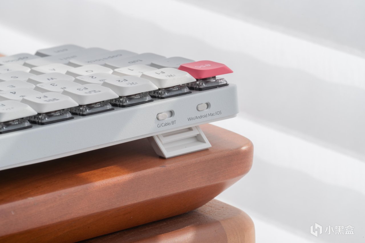 在鍵盤左上角的中框區域,還可以看到兩個按鍵,一個負責切換三模連接模式,另一個則是切換 Windows/Android 和 mac / iOS 的鍵盤佈局。