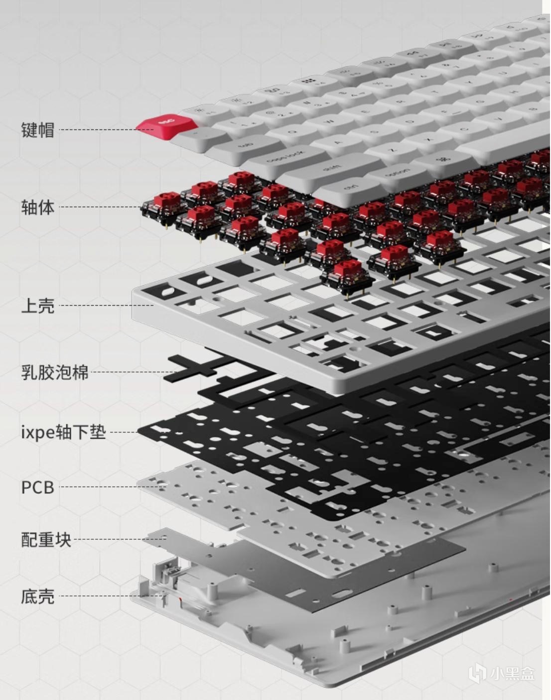 官方提供了一個產品爆炸圖,可以看到它一共有 8 層,從上至下分別是鍵帽、軸體、上殼、乳膠泡棉、ixpe 軸下墊、PCB、配重塊、底殼。