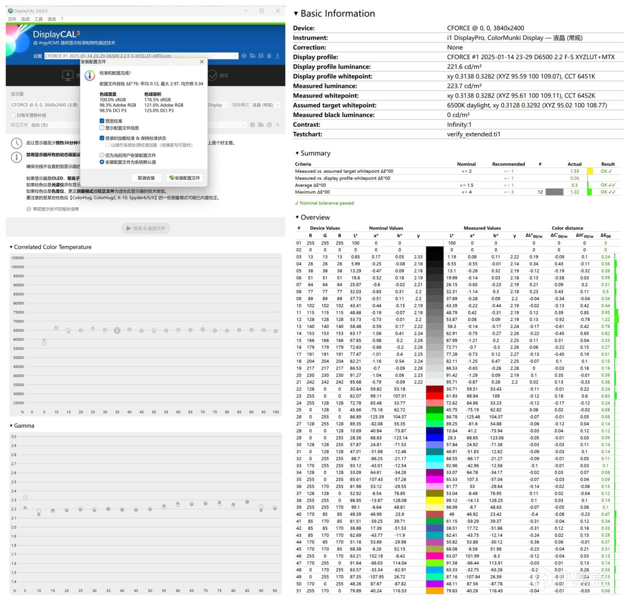 通過愛色麗 i1 Display Pro Plus + Display Cal 進行了校色,可以看到其覆蓋了 100% sRGB、98.3% Adobe RGB 和 98.5% DCI-P3 色域。屏幕實測亮度 223.7nits,伽馬曲線爲 2.2 光度,白點爲 6452K。對比度達到了無限,色準表現方面,經過校色之後 51 個色塊檢測下的平均 △E = 0.3,最大 △E 差值爲 1.22,色準表現非常優異。