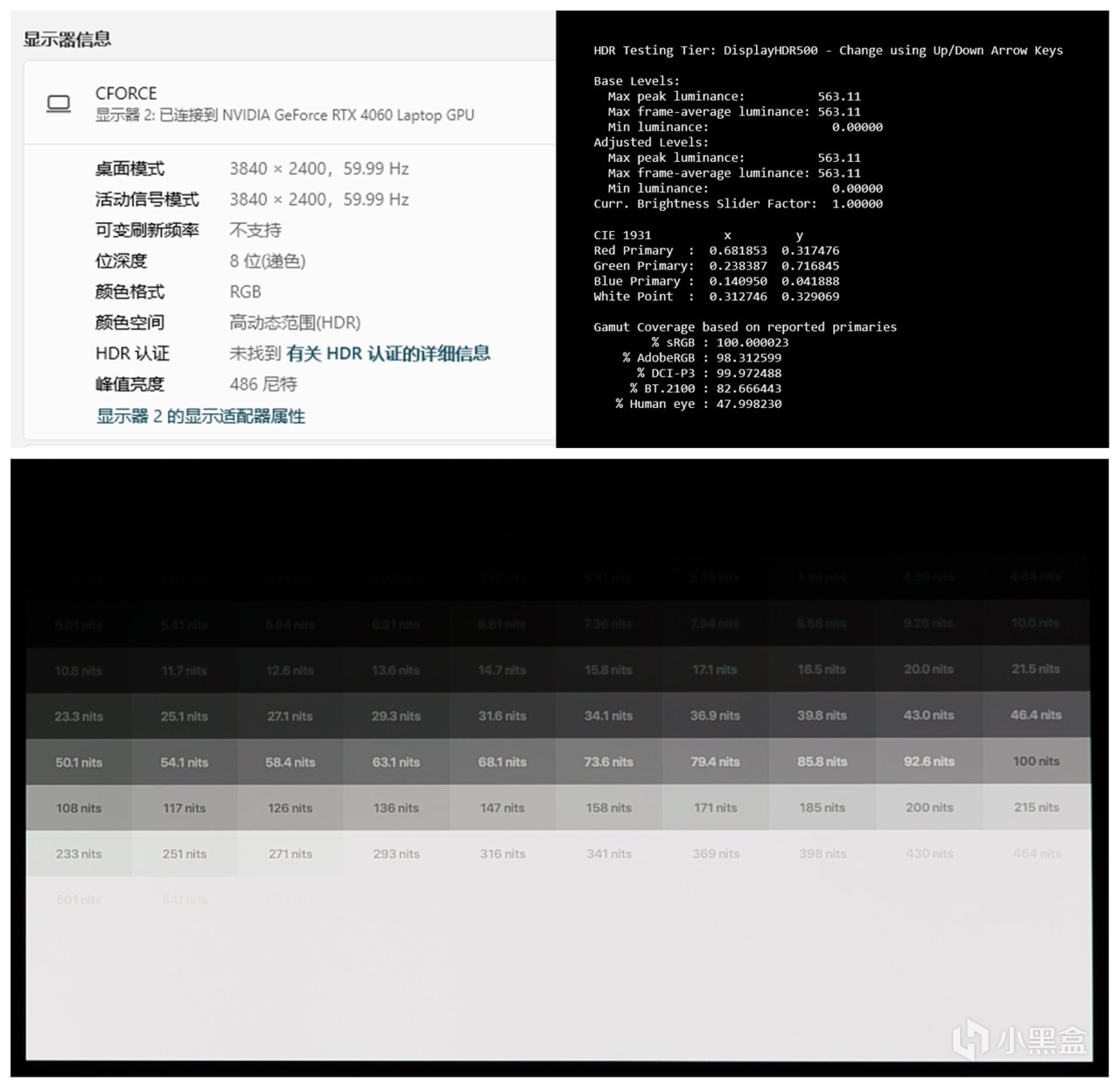 同時 OLED 面板擁有 LCD 屏幕難以比擬的黑位優勢,因爲子像素不發光,它的黑電平亮度可以低至 0.0005nits,而 HDR 模式下的峯值亮度可以達到 486nits,播放 HDR 內容時映射可以支持到最高 584nits。