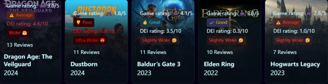该网站专门从“多样性公平”和“包容性”,也就是臭名昭著的“DEI”角度来为游戏进行评测打分。不过虽然是打分,但多少有些令人难绷:明明采用了0到10的评分标准,但如果这款游戏过于不够符合DEI的需求,竟然还能打出负分出来。多少是带有点任性了。