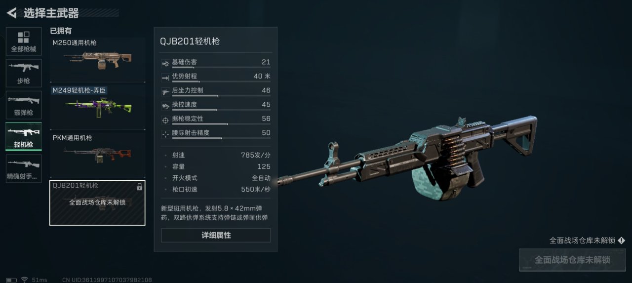 然後是輕機槍了,這把槍在大戰場還沒見到誰用過,它的獲取條件也沒搞懂是啥,好像是和烽火地帶有關,有知道的朋友可以分享一下獲取方法嘛。