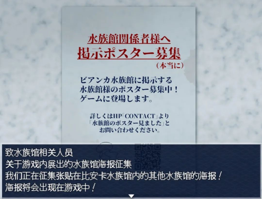橙々在她所描绘的游戏世界里,构建了一座位于她老家的水族馆,你能从场景的交互与角色对话中感受到作者对水族馆的实地考察之细致;当游戏场景转向阴森恐怖的异世界之后,橙々对恐怖氛围的把控也确实能体现出她对“恐怖”二字的深刻理解,不会吓得人举步维艰,也不至于让你玩得昏昏欲睡。