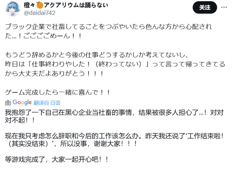 其实“5人开发团队跑了4人”还不是橙々身上最传奇的经历。这位现役全职独立游戏开发者偶尔也会回忆起自己就职于黑心企业的那段岁月,每天工作十几个小时是家常便饭,累到趴在洗衣机上睡觉也是无奈之举。根据橙々的自述,她在大学毕业之初误打误撞进入了一家黑心企业,没干几个月就离职了;2022年结婚后她再次求职,怎料这回又闯进了狼窝,过上了牛马不如的日子。