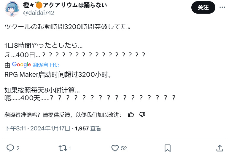 橙々对RPG Maker的了解不多,她擅长的是画画而不是做游戏。从零开始学习游戏制作,似乎是橙々无法避开的抉择。2017年12月,橙々在推特上汇报自己购买了正版RPG Maker,等到2024年年初,她的软件启动时间就已经突破了3200小时。