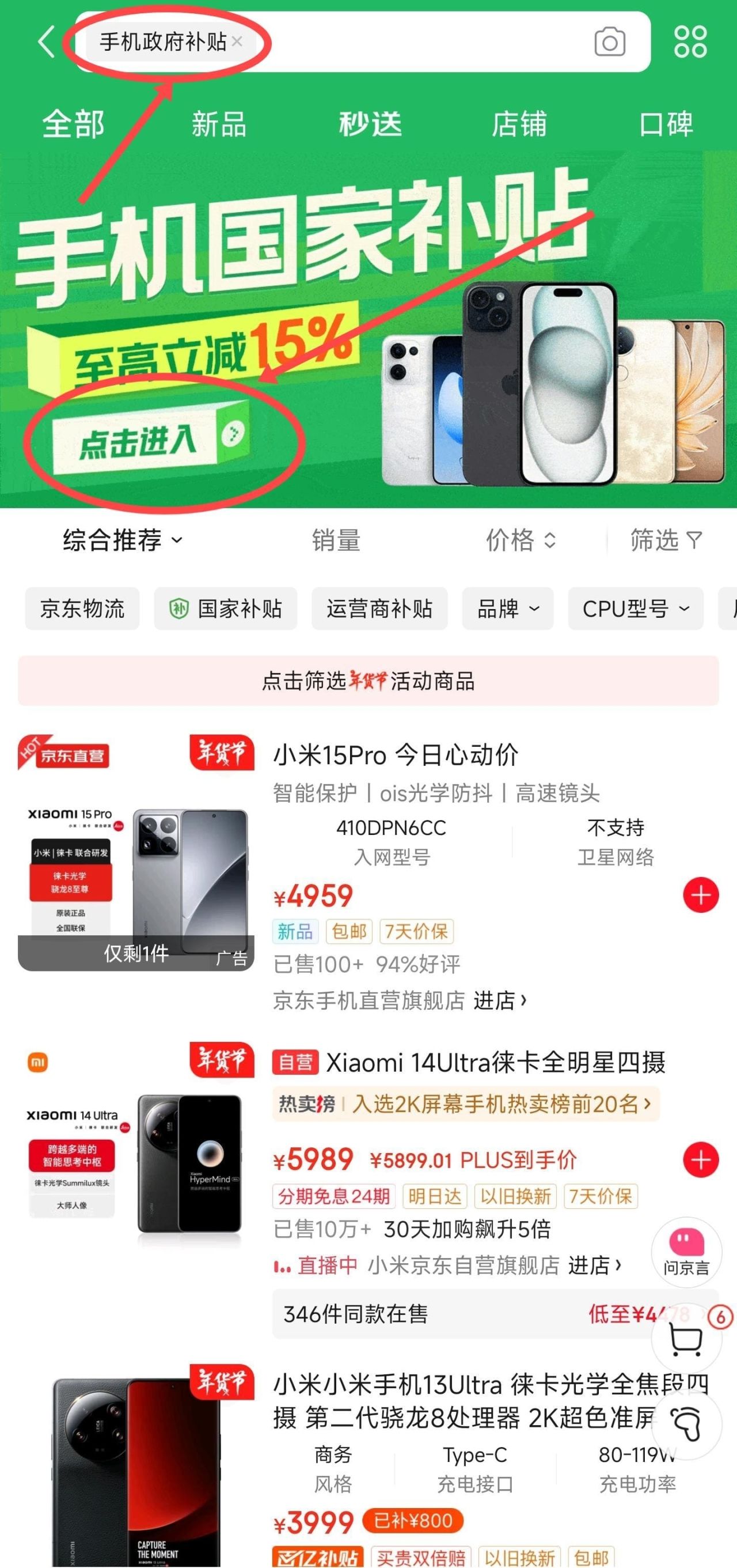 1、搜索欄輸入“手機政府補貼”進入會場
