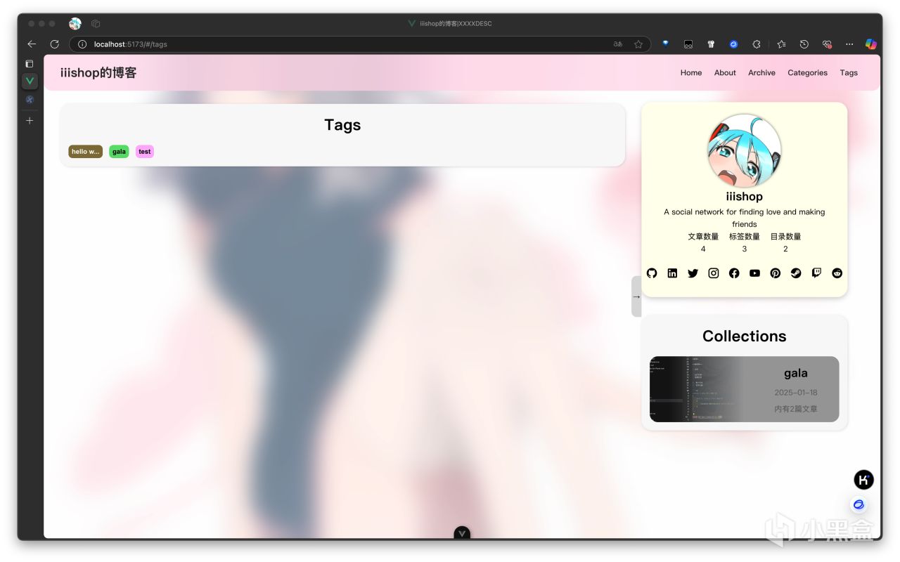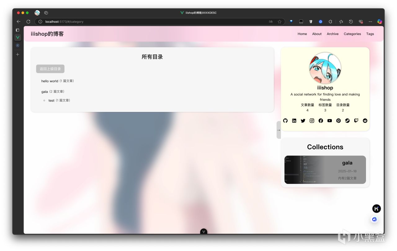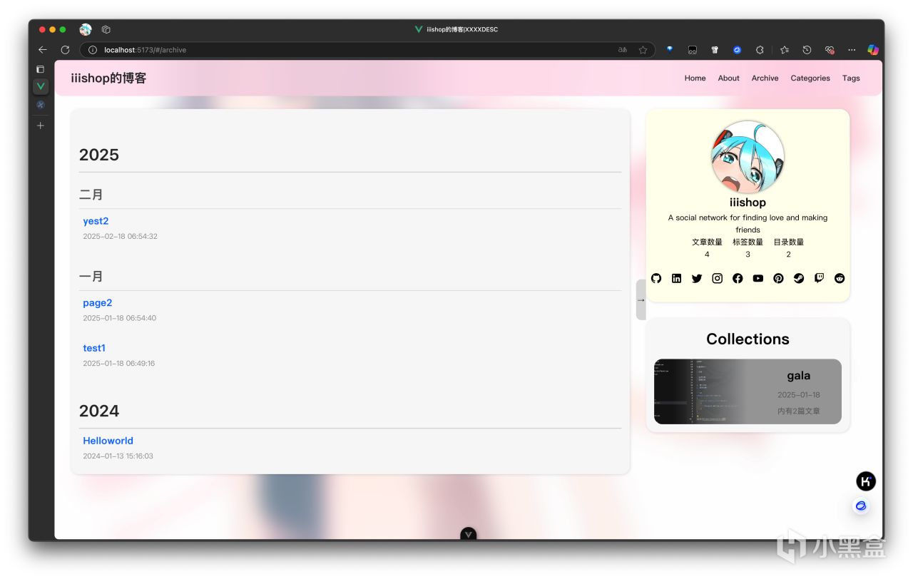 进入首页,即可看到一个由顶部菜单栏、左侧文章列表、右侧个人简介和合集栏组成的页面。顶栏中的Archive和Categories以及Tag均已实现功能,在之后会说明。