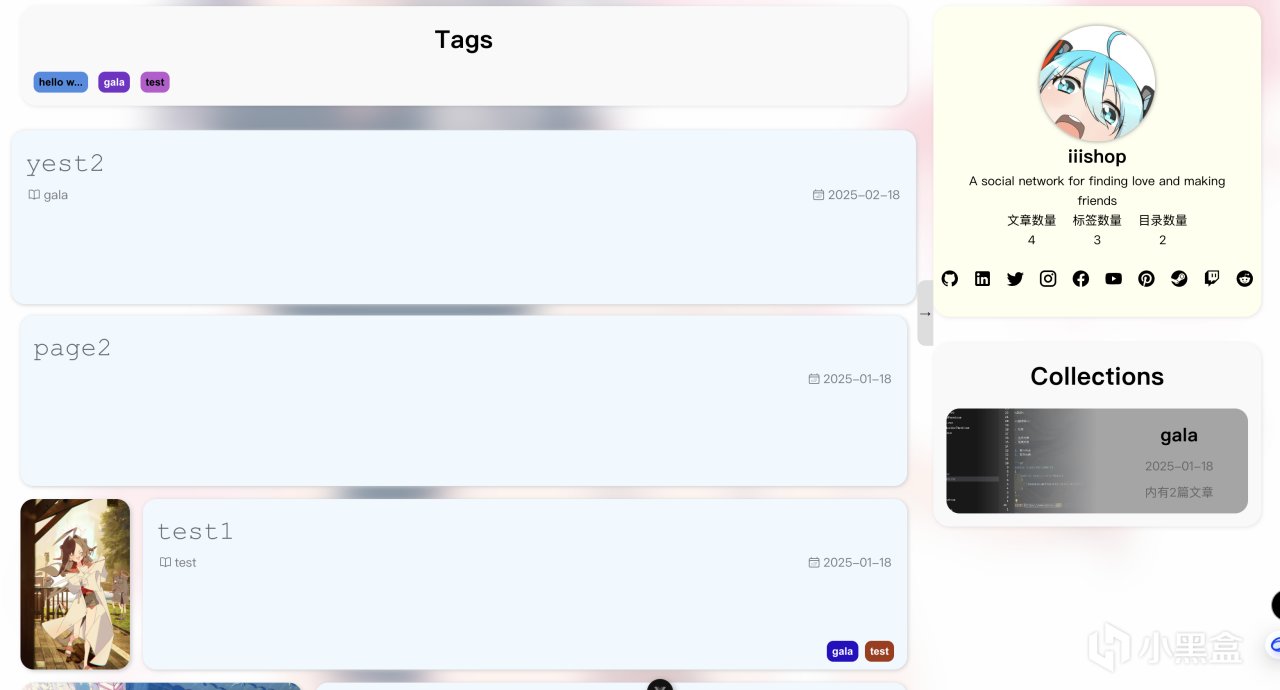 当初的目的是想方便地将自己认为感兴趣或者同一类别的文章放入一个合集中,有点像Tag和Category的一个组合。在/src/Posts下创建的文件夹都会被当作是一个Collection,其中的第一张图片或者动图,会被当作这个Collection的预览图