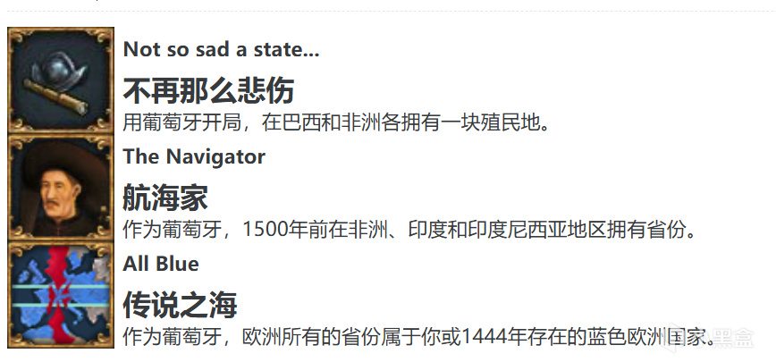 建议先玩葡萄牙熟悉殖民套路后,再玩西班牙。不再那么悲伤相当简单,航海家对于新手来说需要抓紧时间,开局不要在摩洛哥/突尼斯浪费太多时间,尽早开始殖民。至于传说之海,对于外交/陆战能力偏弱的葡萄牙来说挑战不小,新玩家可以熟练后再尝试。