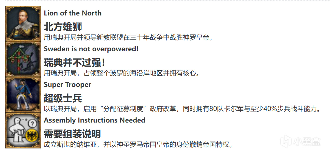 难度不高,沿着任务树打即可,在提前100年发生的30年战争中击败奥地利。需要注意通过任务成为新教派系领袖后,积极扩军备战并拉上盟友(法兰西奥斯曼至少一家),击败奥地利成为皇帝后,尽快提高帝国权威推动改革,以完成需要组装说明。