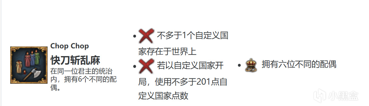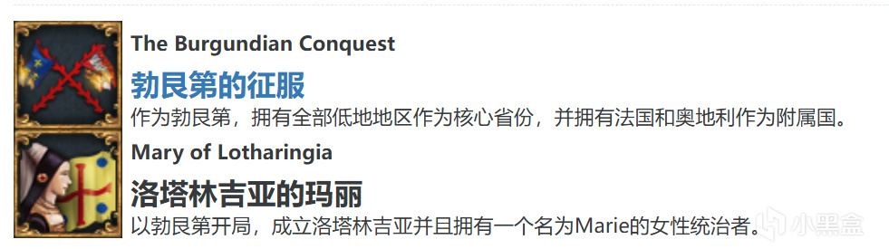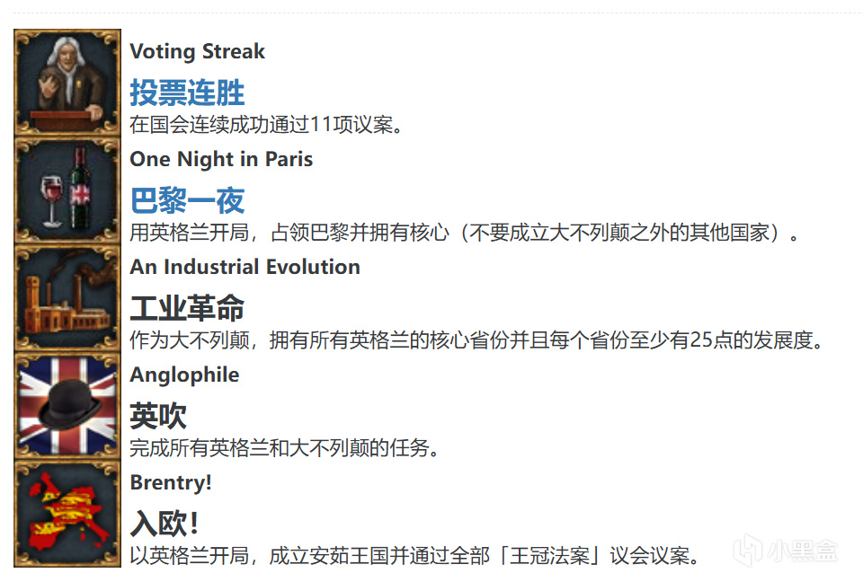 英格兰的五个成就都不难,早期如果英法战争有难度,可以选择暂时放弃欧陆,先成为足够强大的殖民帝国再重返欧陆。近期的DLC更新了安茹帝国线,能够联合统治法兰西成为欧陆强权,可以尝试。此外英格兰独特的圣公宗宗教,以及与其他欧洲大国不同的开局就是议会制,也可以帮助新人熟悉机制。同时圣公宗可以离婚,也可以抽空完成快到斩乱麻成就,在亨利八世通过事件成为继承人并上位之后做就更原汁原味了。