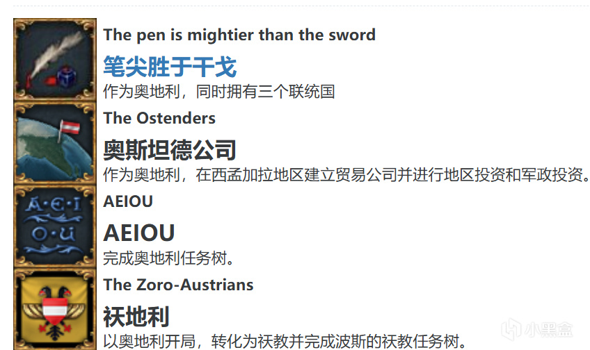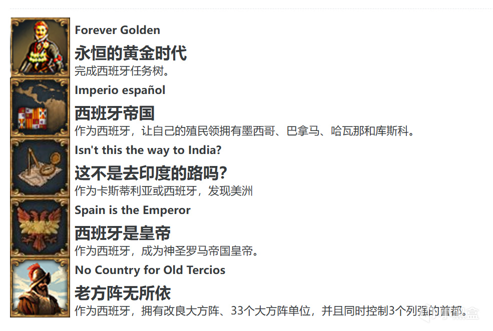 五个成就建议都做完,最难的也只是困难级别,基本做完任务树达成永恒的黄金时代后,其他任务也都七七八八了。打完之后对于欧洲大国如何处理欧陆战争、殖民贸易、神罗机制基本就很熟悉了。