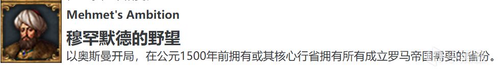 罗姆苏丹和巴黎帕夏都是普通难度成就,以奥斯曼的强大不难达成。穆罕穆德的野望是疯狂难度的成就,对新手来说过难,可以作为毕业考。当然能做这个成就的玩家根本不用看我这篇文章了。