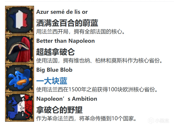 法兰西是建议一直达到第四世代革命时代的,拿破仑的野望需要法兰西发生革命,革命对其他国家来说是灾难,对法兰西是第二个黄金时代,去感受下革法陆军的强度吧。其中一大块蓝虽然是极难成就,但随着最近的DLC对法兰西的加强,目前的难度估计在普通与困难之间,开局正常打就能达成。