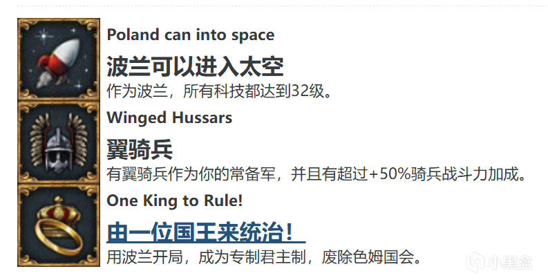 波兰强度很高,且开局就送立陶宛联通,是能够单独阉鸡的存在,翼骑兵难度较低。相对比较负面的波兰选王制度比较坑,由一位国王来统治可以参考wiki的攻略。波兰可以进入太空就是纯纯的拖时间成就了,32级科技基本都是1800年之后了,五速看海等成就跳出吧。