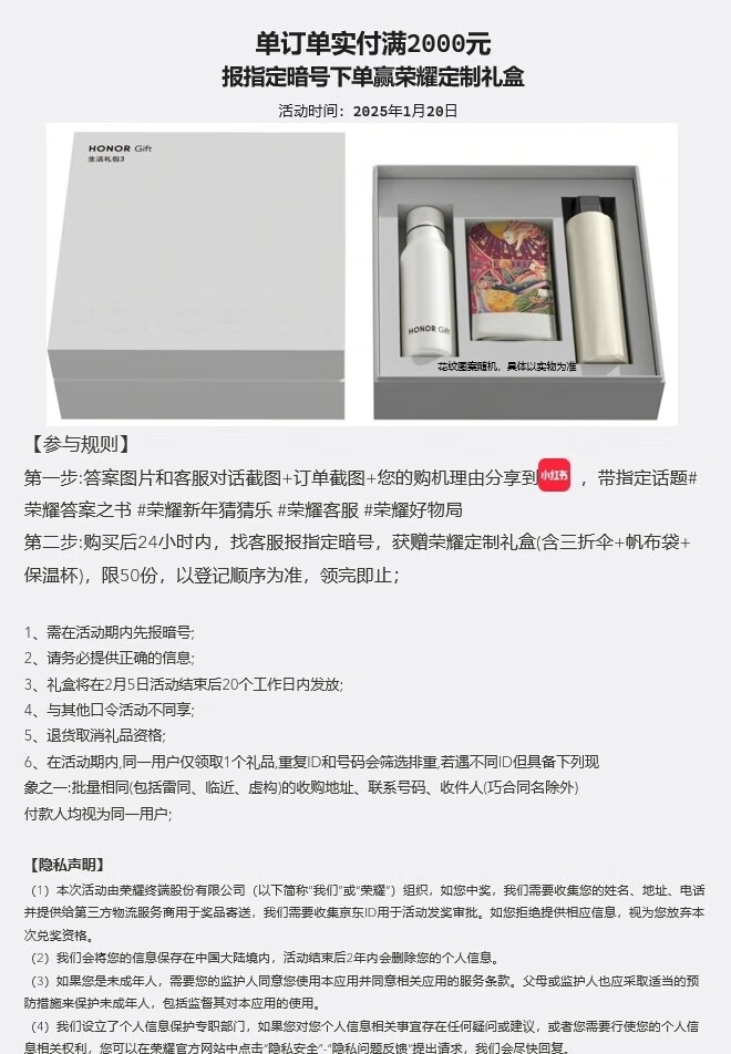 购买了荣耀magic7或7pro以及荣耀其他型号🈵2000以上还可以再领一个礼品!不过需要发xhs,购买前或者购买后24小时内联系客服都可以!