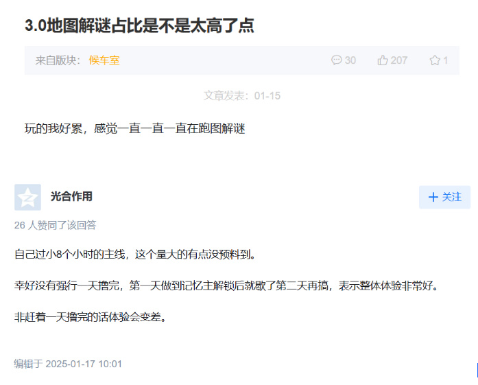 然後是第二個問題,爲什麼有些人甘之如飴,有些人覺得解謎過多影響了體驗呢?從玩家風評的轉變可以看出些端倪。可以看到,吐槽3.0版本解謎過多的聲音基本都出現在版本更新後的前兩天,到了後面開始有玩家表示自己分了兩三天才打完,迷題設計的難度適中,還有引導,體驗非常不錯。