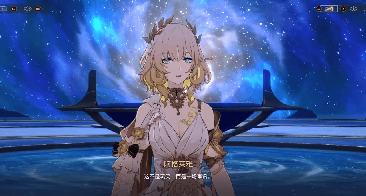 除了以上兩點,還有一小段劇情引發了小小的爭議。就是開拓者與丹恆爲了救一位NPC,被迫打破了與阿格萊雅的約定,透露了天外的事,然後被阿格萊雅審訊威脅的情節。這其實是一段非常大膽的劇情嘗試,因爲它不太符合如今流行文化的常見基調,但卻很符合事實發展邏輯。