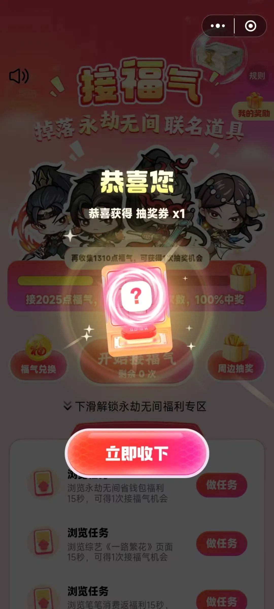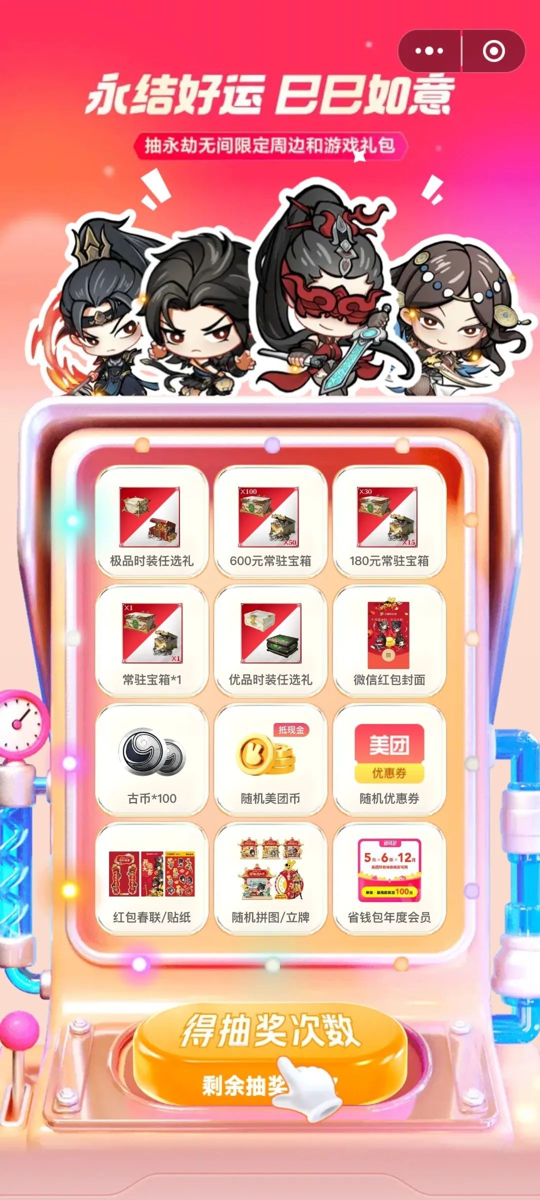 積攢2025點福氣,還可以獲得1次抽獎機會!永劫無間遊戲道具兌換碼、永劫無間 X 美團團購定製實物周邊、永劫無間 X 美團團購定製微信紅包封面、省錢包年度會員、美團優惠券、美團幣等超多獎勵等你來拿!