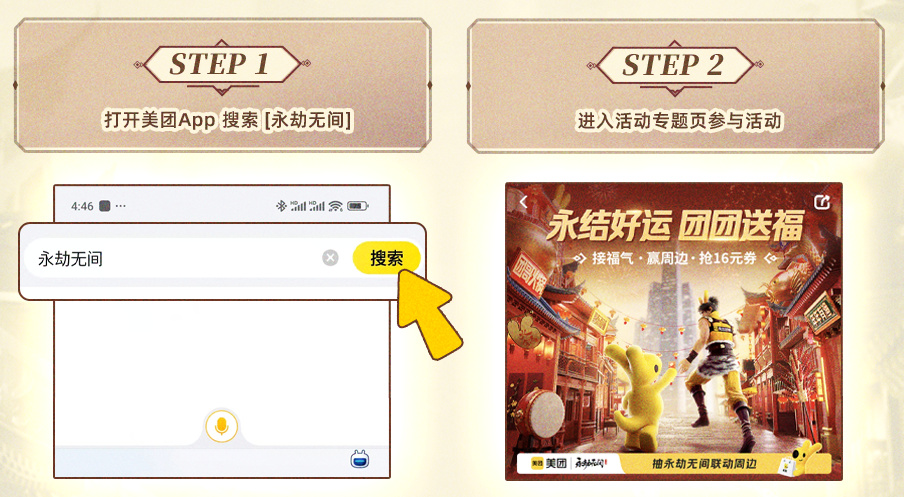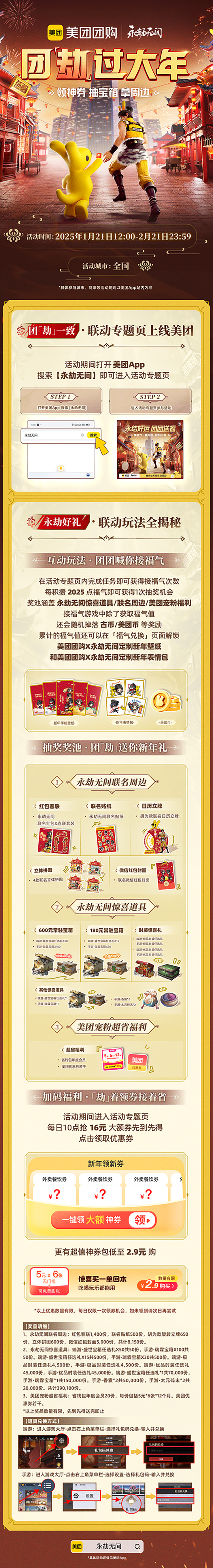2025年1月21日12:00:00—2025年2月21日23:59:59,上美團搜【永劫無間】,即可進入聯動會場。參與接福氣遊戲,有機會領取50抽盛世寶箱任選禮、極品時裝任選禮、聯名周邊、美團優惠券等福利!