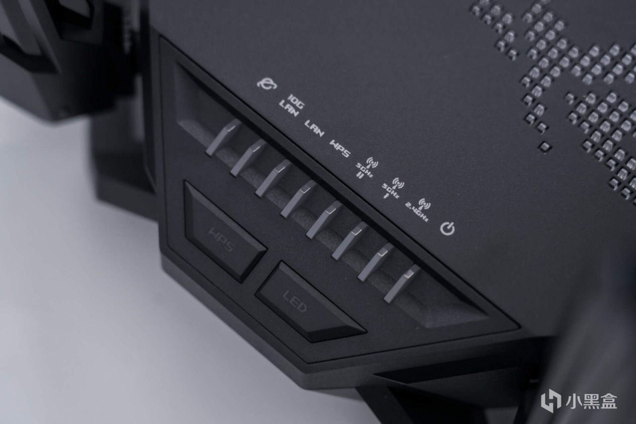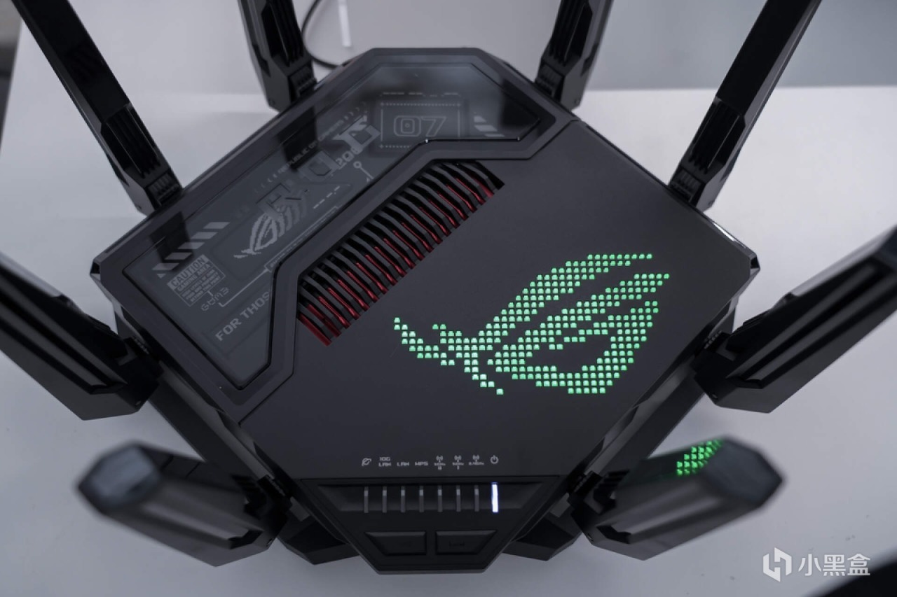 再来看外观,ROG在外观细节方面从来都不吝啬,八爪鱼7顶部布置有大面积的败家之眼LED点阵LOGO,可以在固件中自行设置RGB灯效。透明亚克力LOGO搭配霸气侧漏的散热格栅,也使得整台路由器的造型充满了极强的爆发张力,作为最顶级的八爪鱼系列延续,这种张力可以说再次升级。