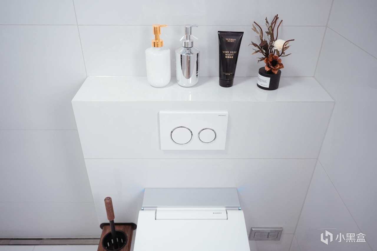 悬挂式设计+水箱入墙,马桶整体更显轻薄灵动,整体简约大方。新建墙顶部可以用于摆放浴室用品,一点程度上扩充了浴室可使用空间,摆放一些香薰更添美观度。