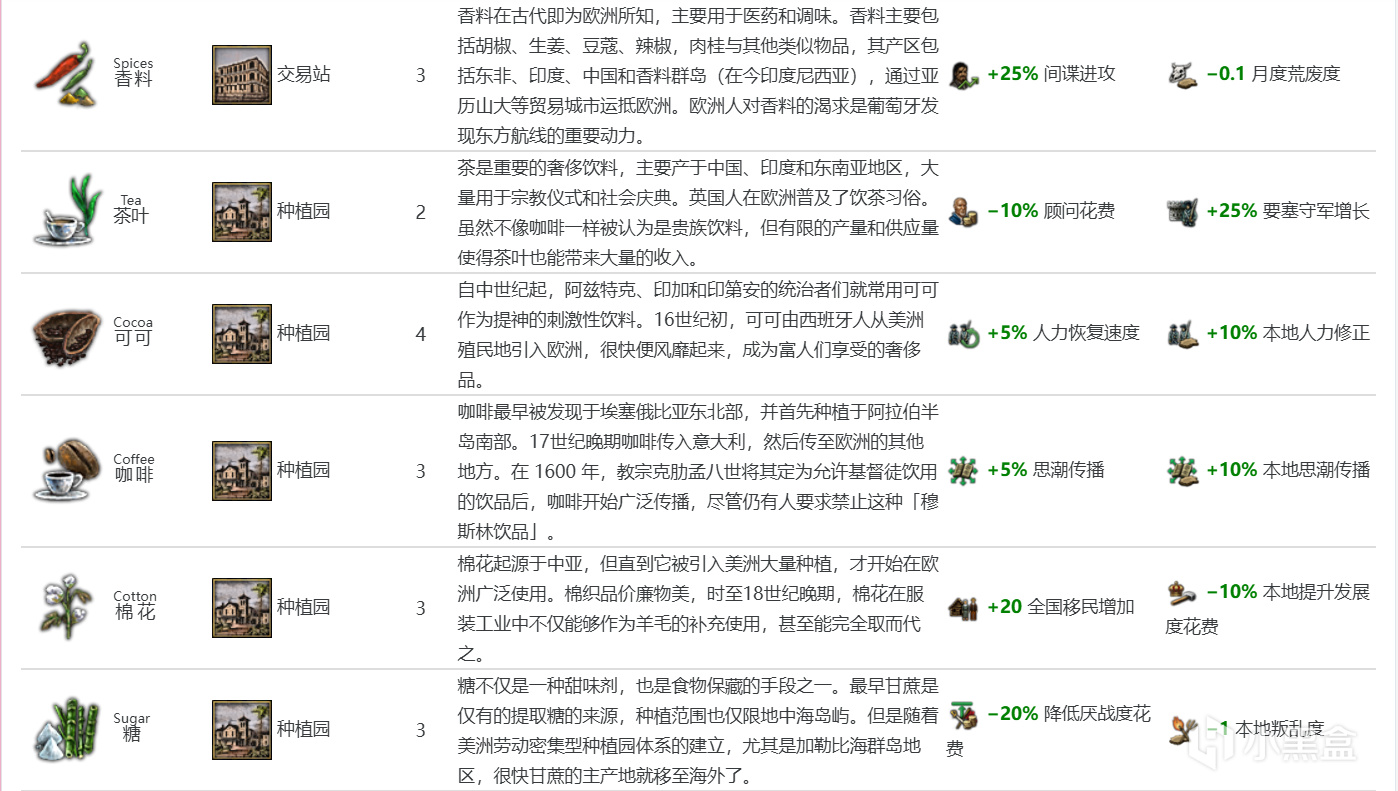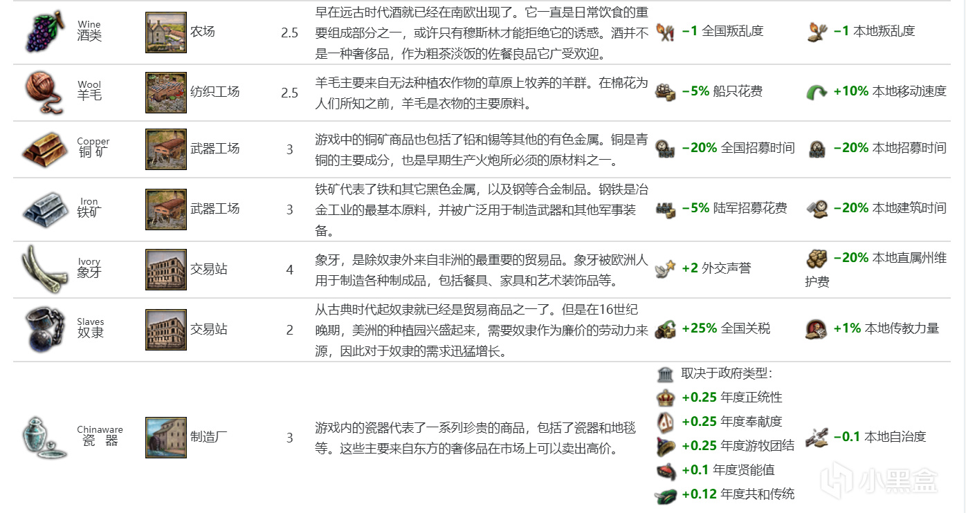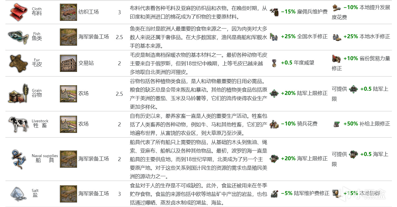 穀物(基礎價格2.5):該遊戲以陸軍爲主,20%陸軍上限修正很強。1500年降價至2,1600年/1650年事件降價(時限2年/10年),價格挺爛的;