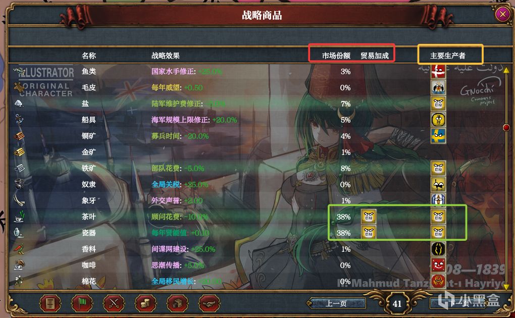 一個國家控制某種商品至少20%的全球貿易額時,將會給予該國一個名爲“(商品名)貿易”的獎勵修正。每種商品的當前市場份額可在統計報表找到。