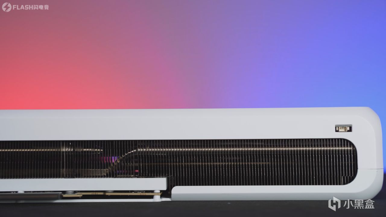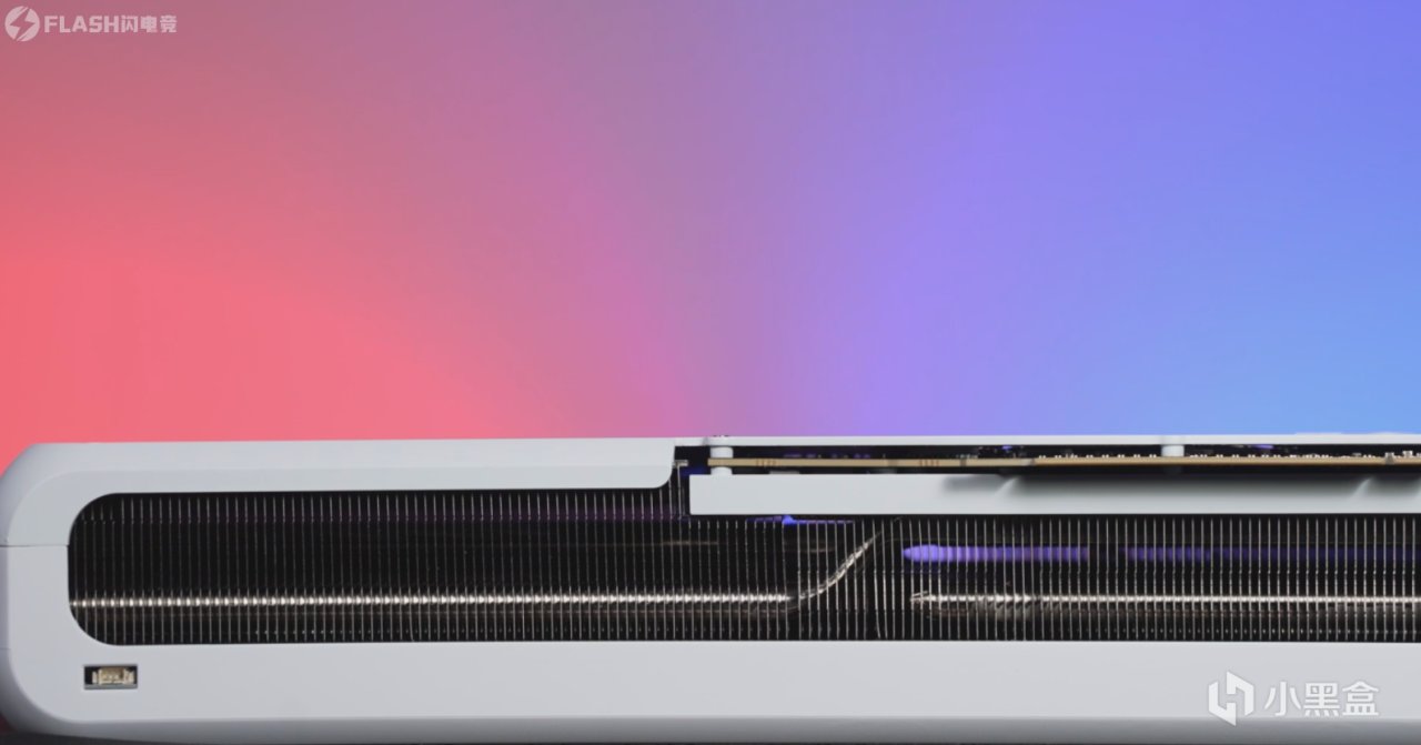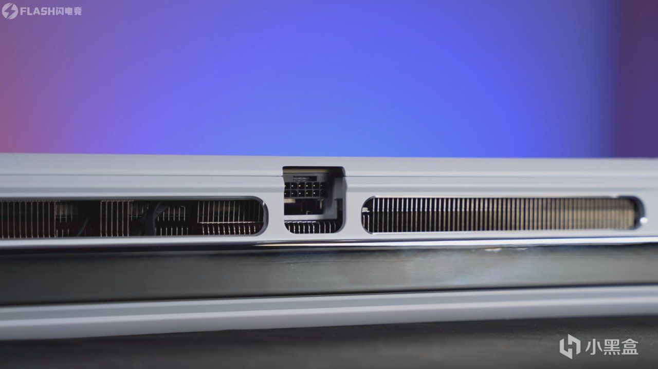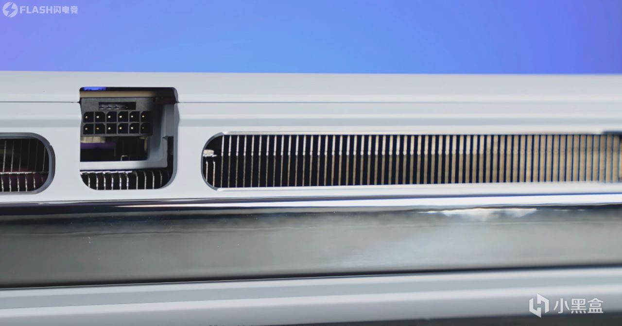 拉通的设计,能够有效防止显卡弯曲。中间是16Pin供电接口,怎么说呢,这个侧面算是完美符合国人的对称审美了吧。