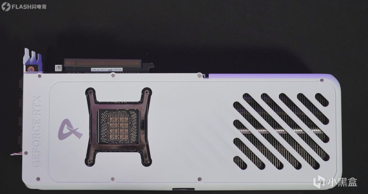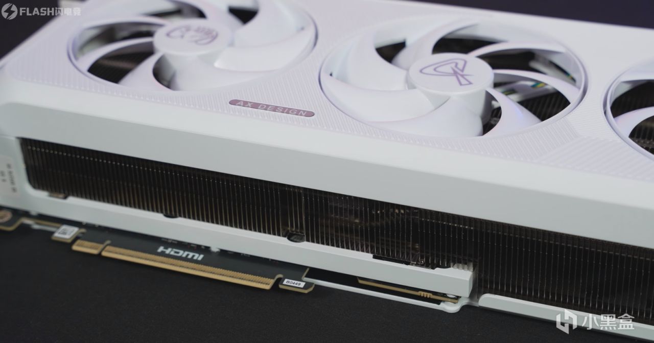 另外,从这一面看,这张显卡的散热规模变得清晰起来,使用了跟40系猛禽、50系夜神这种顶级旗舰同款的超大型一体式无隔断鳍片,从头到位拉通,散热性能比普通的分段式更好,这一点可以在40系猛禽、TUF身上得到验证,40系猛禽在热管数量不如TUF、使用同款风扇的情况下,仅仅依靠巨型散热器,就完成了温度的反杀。