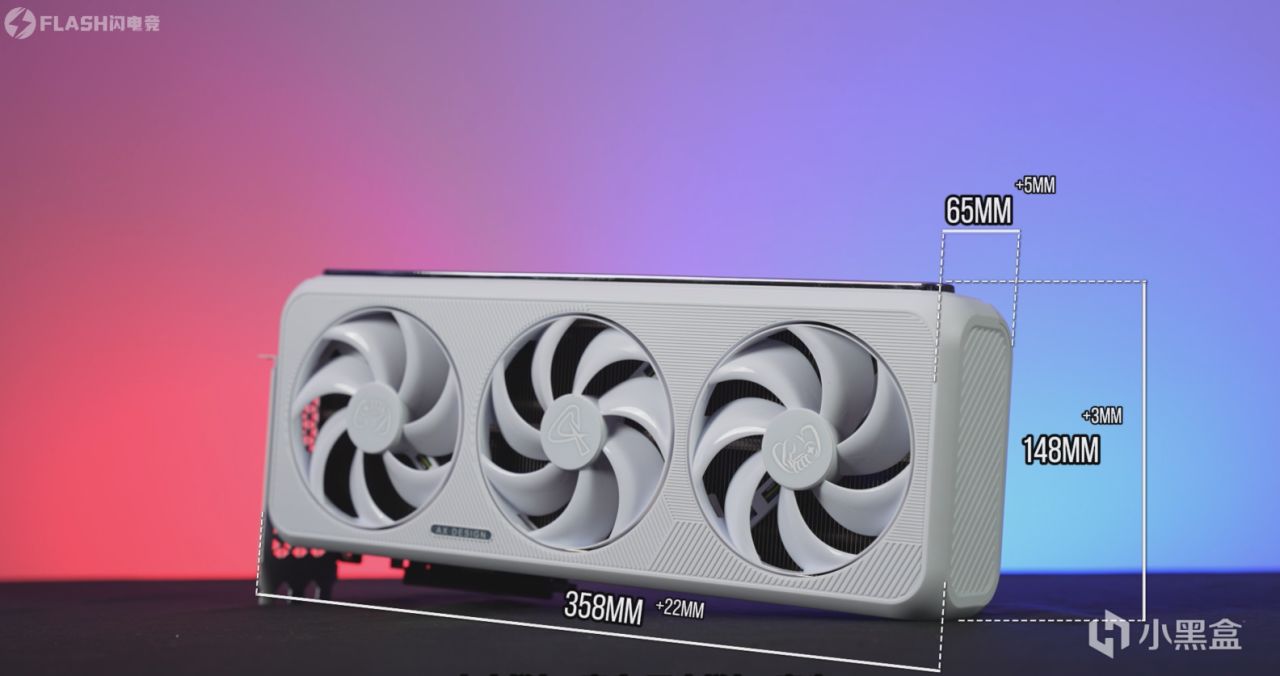 然后就是显卡本体了,整体为纯白配色,而且比较圆润,长358,宽148,厚65毫米,相比上代加长了22毫米